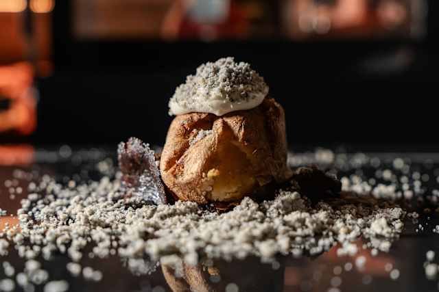 - Patata cotta sotto la cenere aromatizzata al lardo di colonnata, servita con cremoso di caprino, cardoncelli brasati e finta cenere all’olio d’oliva