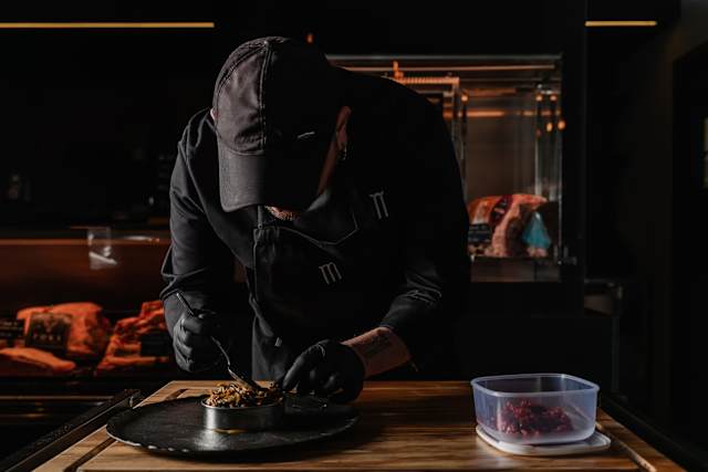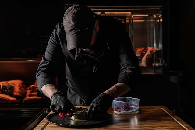 - Tartare di rubia gallega servita con riduzione di piselli, fonduta di parmigiano e tartufo nero (150 g)