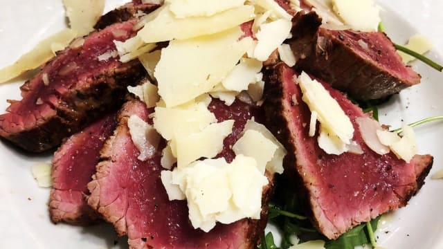 Thickly sliced beef served wilh rocked and slivers of grana padano cheese