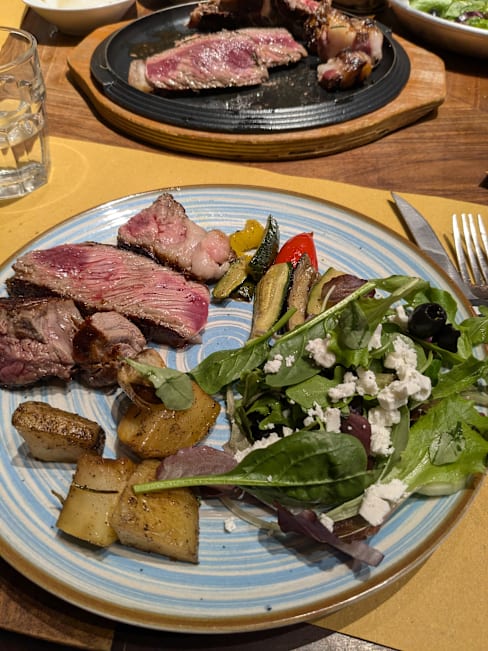 8.5/10The stake was perfect cooked although I didn't except the mushroom sause have mashrums from rhe tin, greek salat and lazania were OK