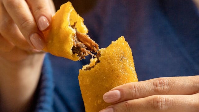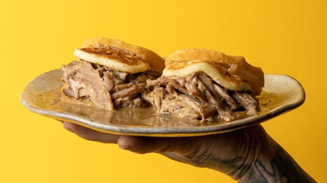 Arepas de maíz rellenas de pierna de cerdo asada y queso fresco acompañadas de sus jugos de cocción
