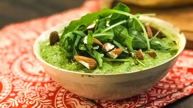Ravioli with pumpkin, cream of kale and breadcrumbs