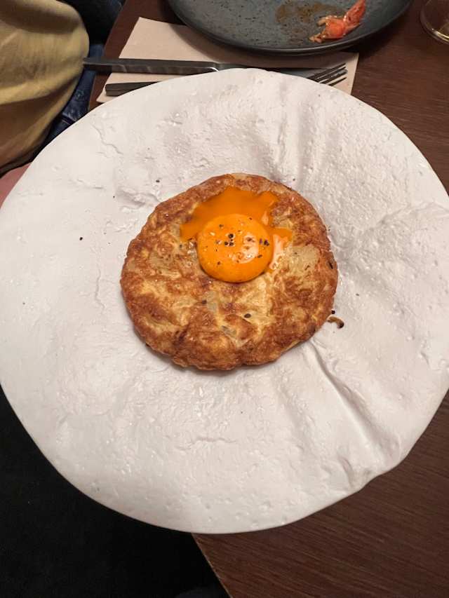 - Patata confitada, cebolla caramelizada y yema de huevo