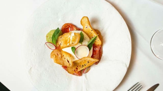 Con tomates de temporada, pesto genovés, rúcula y pan tostado