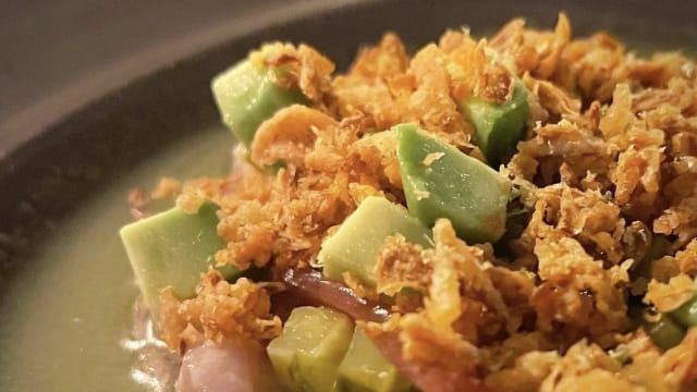 Tartar de corball amb sopa freda de cogombre i alfàbrega
