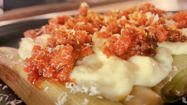 Porros a la brasa amb salsa holandeesa. sobrasada i nous