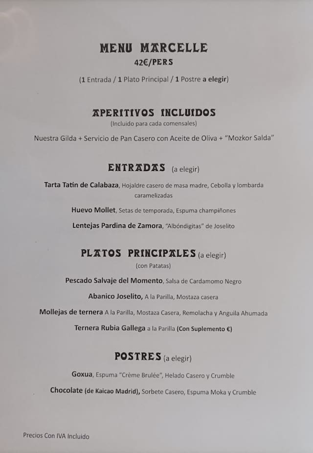 10/10+1What a wonderful dinner we had at Marcelle on our first night in Madrid. We are big fans of small restaurants run by a couple, and this one really delivers. It feels like you are dining in the chef’s house. Excellent progression of amuse, bread course, appetizer, main and dessert. While the menu is limited (three choices per course), everything was very well executed and delicious. Fantastic value all around and a highlight of our trip! Definitely reserve ahead.