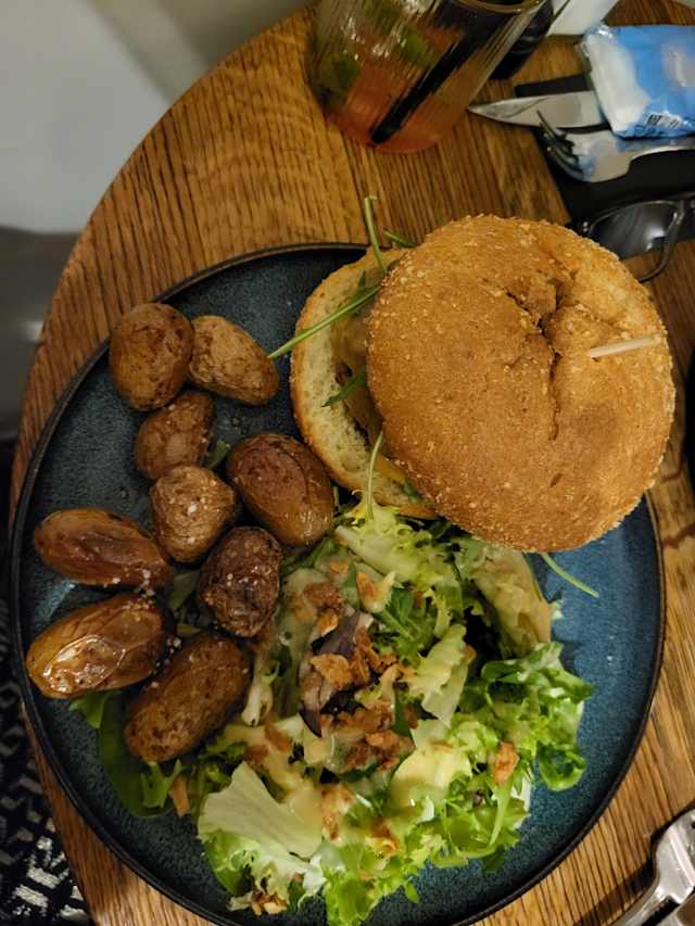 - Steak végé* aux épices, tomme vaudoise fondante au cumin, pickles d’ oignons, tomate, roquette sauce blanche aux herbes fraîches