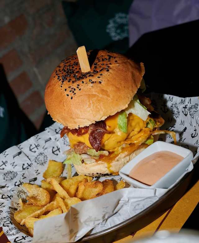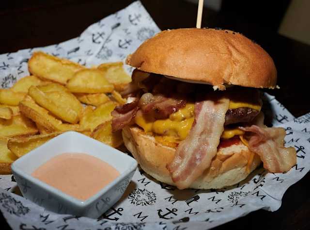 - Burger 200gr 70% di manzo (beef) e 30% di maiale (pork) e jalapeno con bacon, cipolla marciana, pomodoro, insalata, uovo all’occhio, formaggio cheddar e salsa barbecue. Serviti con pane artigianale accompagnati da patate fritte e salsa rosa