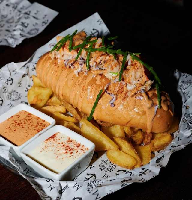 - Polpa di granchio porro (crabs), pan brioche al burro, insalata coleslaw con salsa al limone, patate fritte e mayonese