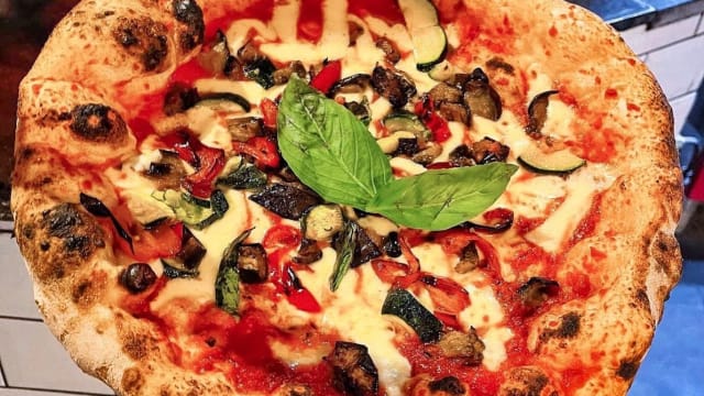 fior di latte campano, zucchine fritte, melanzane a funghetto, friarielli, funghi champignon e patate schiacciate. In uscita basilico fresco