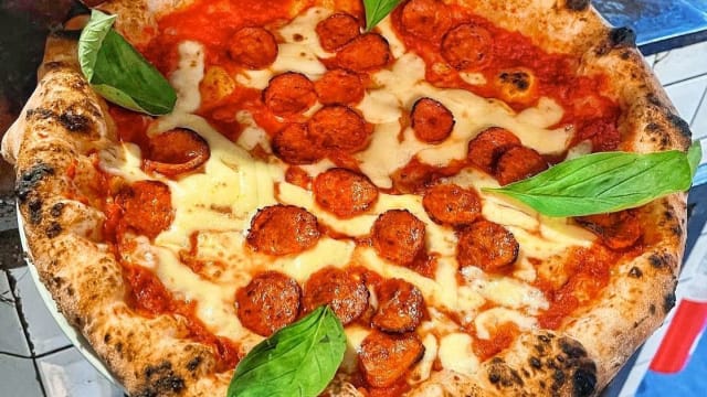 Pomodoro pelato dell’agro nocerino sarnese, salame piccante e fior di latte campano. In uscita: basilico e olio EVO
