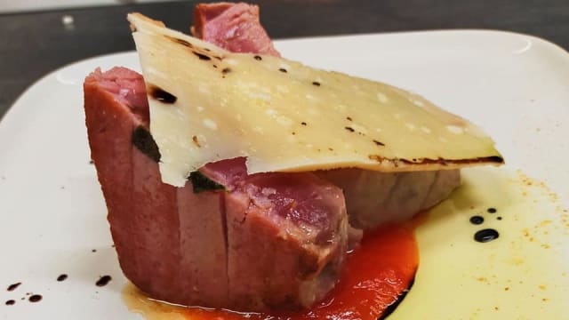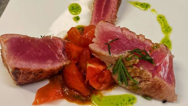 Filetto di tonno rosolato al lardo di colonnata e erbe aromatiche di sottobosco servito con chutney di peperoni e foglie di misticanza
