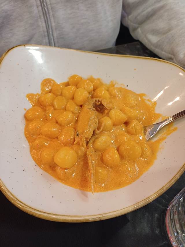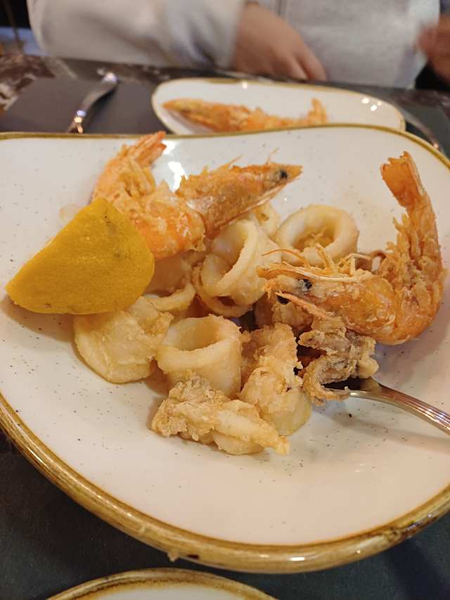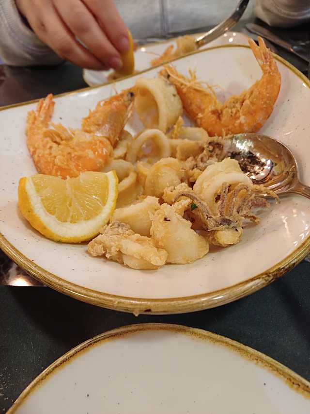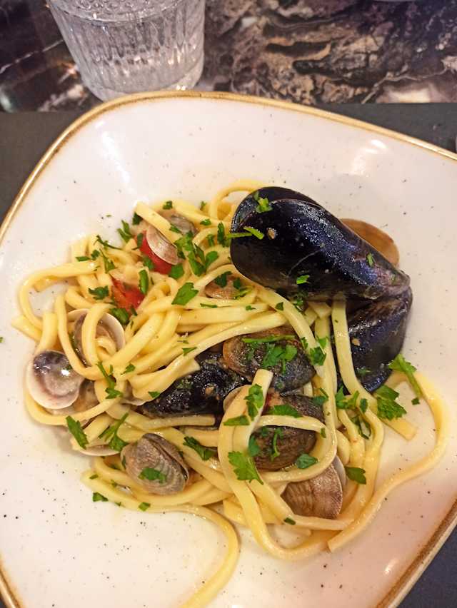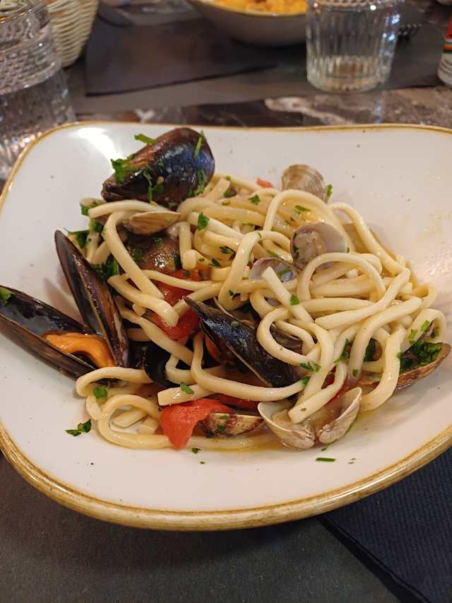 - (Cozze, vongole, gamberetti, seppie e pachino)