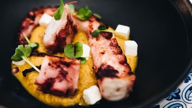 Polpo fritto cacio pepe e fave