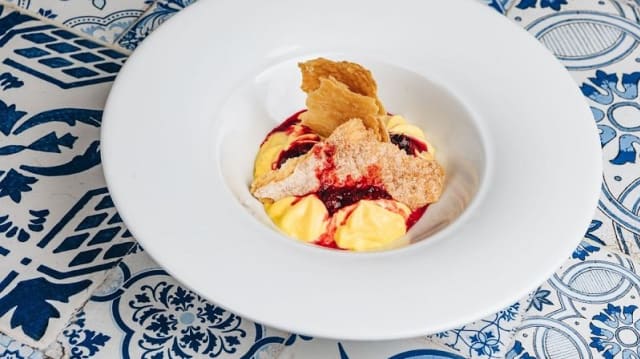 Bomba ripiena di crema al latte e salsa al passion fruit