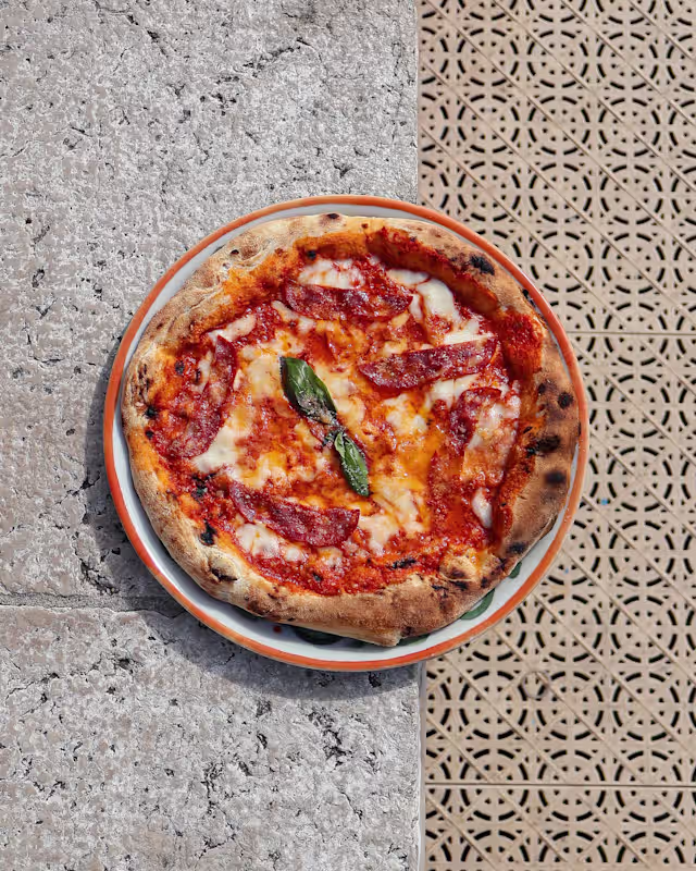 - Sauce tomate, mozzarella, salami piquant, parmesan, basilic, huile d'olive.