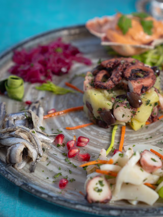 - Frutti di mare, cozze, vongole, seppia, gamberetti, scampo, prezzemolo, olio d'oliva, pomodoro san marzano.