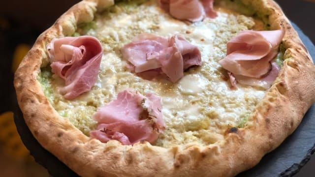 Mozzarella fior di latte, prosciutto crudo , fonduta di gorgonzola DOP dolce , marmellata di fichi , noci