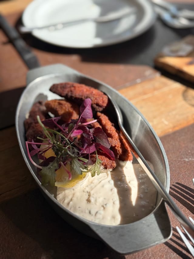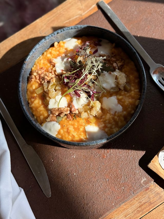 5.5/10I would not go back. Learning that an exciting menu doesn't mean it is good. The blood sausage balls were good but our other starter, carpacio bites were tasteless. Same with the beetroot risotto. Had to heap salt on to get any flavor except watery rice. My husband's duck was delicious though. Deconstructed cheesecake for dessert was okay but the other, which was described as coffee mouse, custard, ice cream, was an ugly mess of frozen disaster. It was so frozen that we couldn't even stab a spoon through it. We told the waitress but she said it is supposed to be that way. So that was left in the bowl untouched.