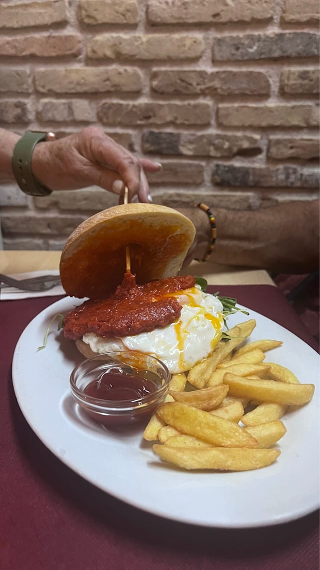 8/10The food was really good:I had a dish of eggs completed with potatos and asparagus. Also the other people with me told their dishes were good. The atmosphere is very funny, total pink, recalling a farm house with coloured knitting works around