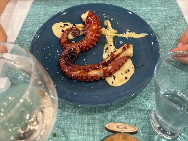 Polpo locale alla griglia adagiato su hummus e olio di prezzemolo