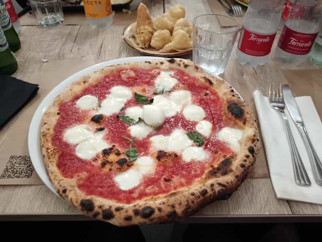 Pizza margherita con cornicione ripieno di ricotta campana e fior di latte vico equense, olio evo e basilico