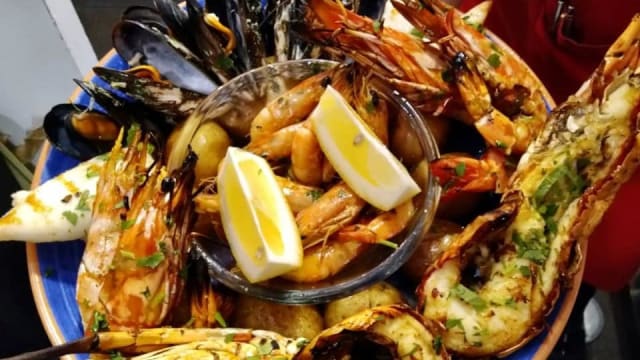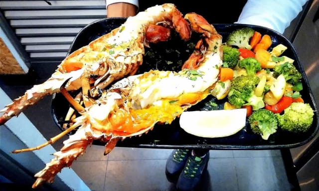 Lagosta grelhada, camarão tigre grelhado, mexilhões ao natural, lulas grelhadas, camarão de moçambique frito batatas a murro e salada