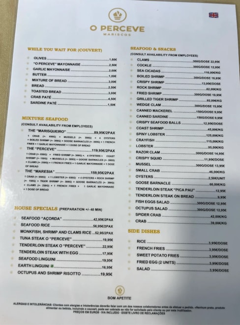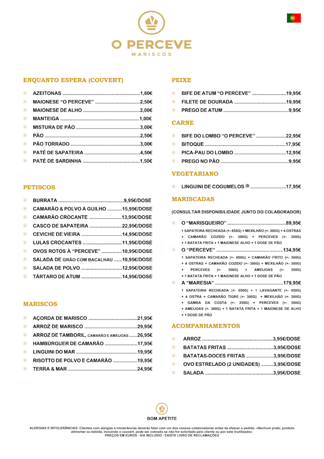 9.5/10You come to the Algarve for seafood. Is the plaxe to eat. Marisqueira O Perceve offers delicious seafood, wonderful service and comfortable atmosphere. I can't recommend it more. I look forward to my next visit. Thank you!
