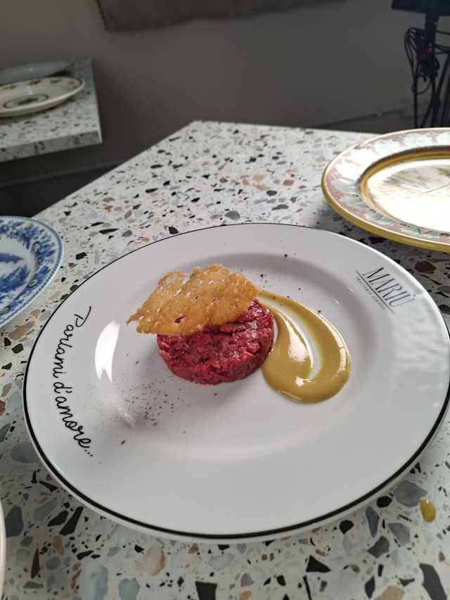 - Battuta di manzo condita con olio evo, sale e pepe, servita con senape al miele