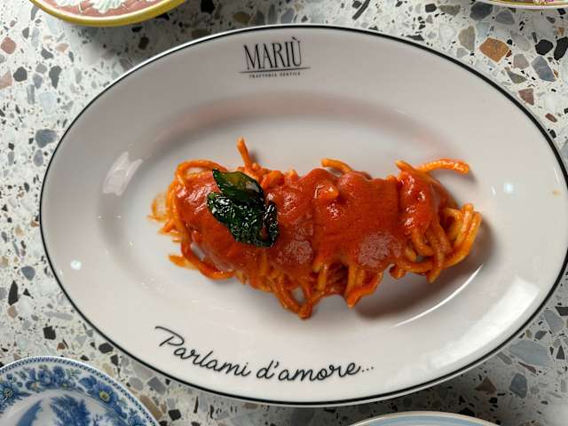 - Spaghettone alla "marinara" con pomodoro, salsa di prezzemolo e poco aglio e peperone Crusco