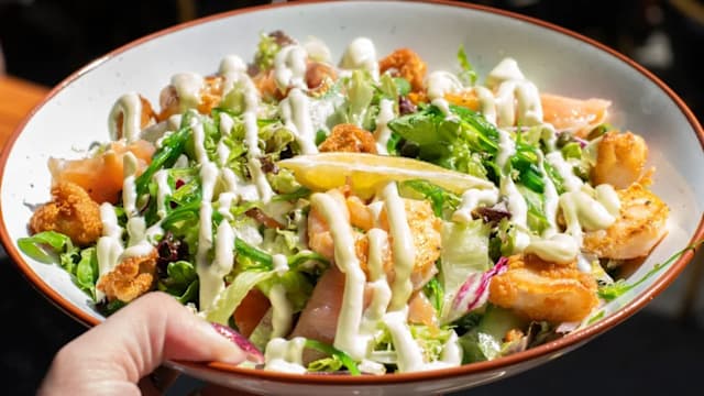 Huisgemaakte pindasaus, frisse atjar, cassave, krokante ui, sesam. Al onze hoofdgerechten worden geserveerd met friet.