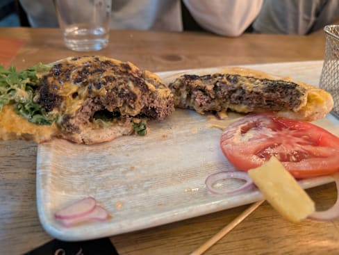 2/10The food arrived after a total of 75-80 minutes of wait since order. 4 burgers took nearly 1h 30m to be fulfilled. When they came, they were overcooked: the double one was not even edible once cooled down. The chips were frozen, tasteless, just like the water at 7€ for 75cl (how is it even possible to charge so much for just water?). Definitely not the quality someone would expect after so much time waiting, and staff didn't even bother when complained about it: they justified saying that they have to serve people in order they serve, which was not true as some other tables received the meals earlier despite ordering after our table. TL;DR: Hell expensive, bad quality, bad service, never coming back for sure. One of the worst experiences in a restaurant ever.
