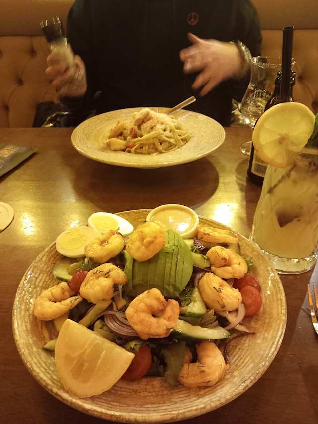 - Garnalen, gemengde sla, avocado, cherrytomaat, komkommer, rode ui, citroen, gekookte ei en cocktailsaus