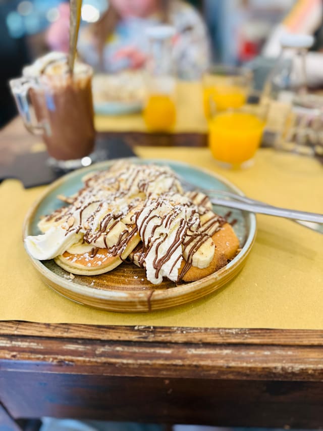 3 pancakes homemade con banana, crema spalmabile di nocciola e panna montata