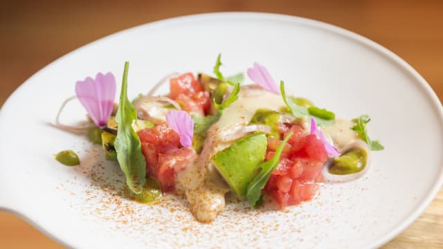 Galete de atún rojo (bluefin balfegó) sofrito de atún con tomate y gastrique, gelatina de ponzu, tomates cherry rehidratados en ponzu y gel de yuzu.