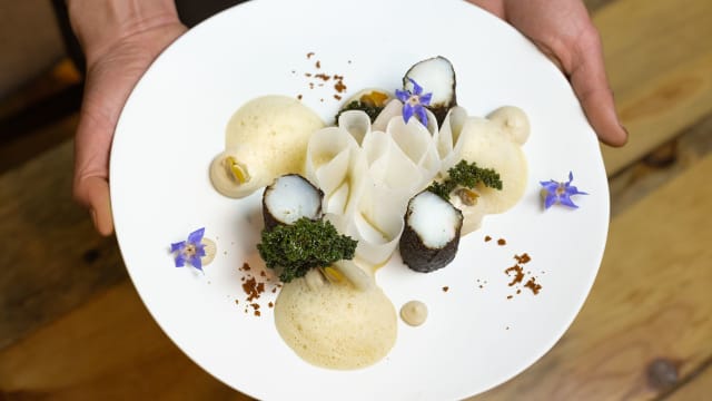 Corvina, gel sauco, meunier, puré de alubias, coles de bruselas