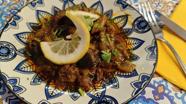 - Fegato di vitello, aglio, cumino, paprika, olio evo, prezzemolo fresco, olive