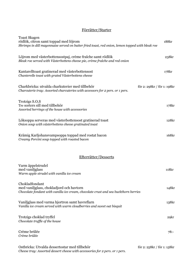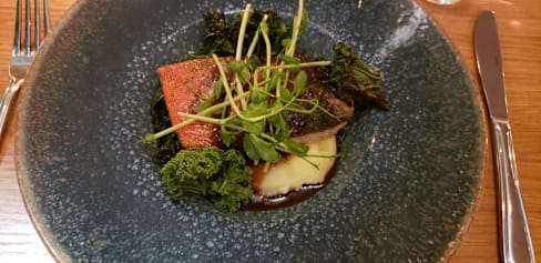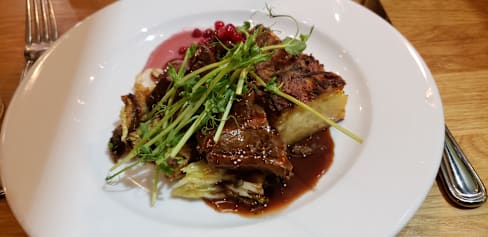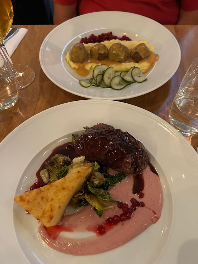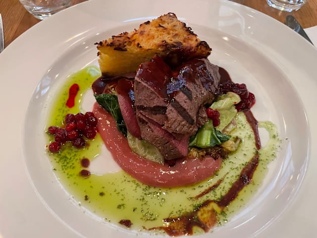 9/10The food was beautiful. We had the charcuterie board for 2 to start, very nice, good quantity. For mains had fillet of reindeer but this dish is very small, you need twice as much meat. We were not full. For dessert I had apple strudel, but it was Just 1cm thick and hardly there at all, very disappointing so I ordered a second dessert, chocolate fondant which was lovely and more satisfying. My husband had the cheese board for 1, which was very large, a lot of cheese. Great food and service but their portions are all over the place.