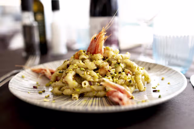 - Raviolo di cernia, pomodorino, mandorle, pesce spada e melanzane