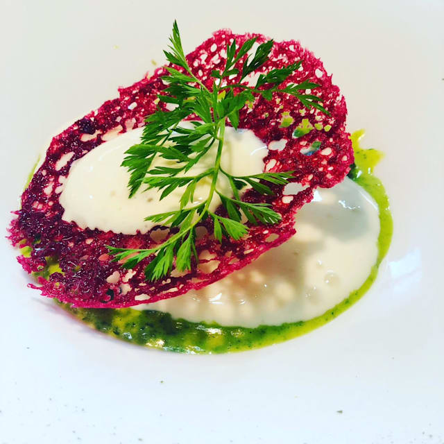 Carpaccio de saint-jacques aux agrumes, brunoise de betterave en mayonnaise au curcuma, bouquet d'herbes aromatiques