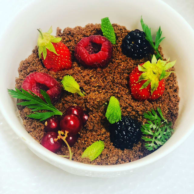 La charlotte mousse à la vanille, mûres fraiches, coulis de fruits rouges et sorbet.