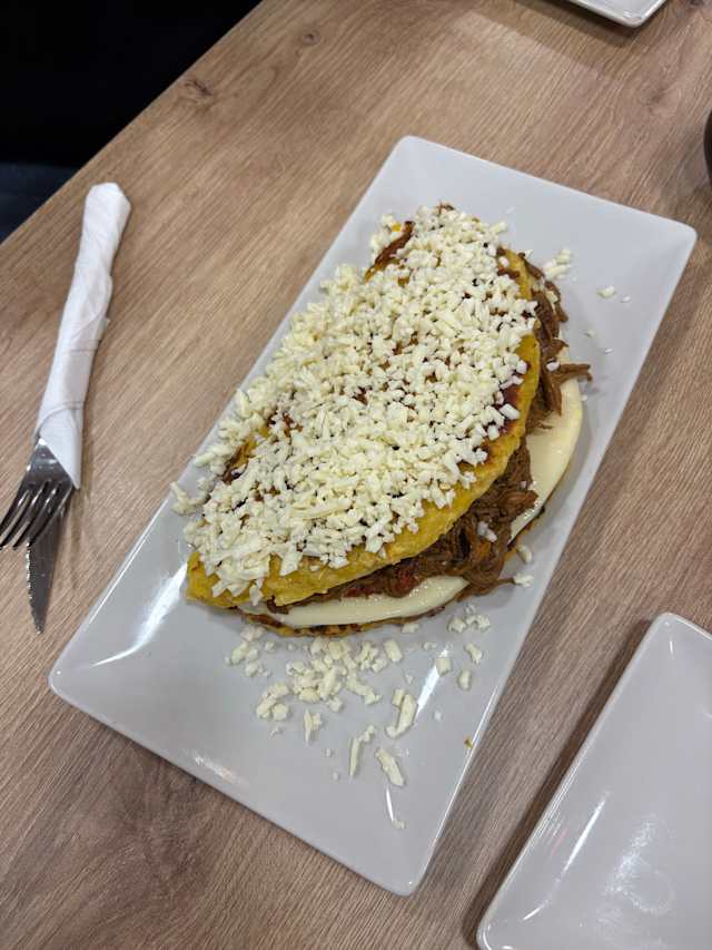 - Judías negras, carne mechada, plátano macho maduro, queso latino