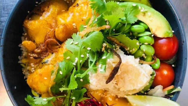 salladsmix,linser, avokado, mango, koriander, nötmix, friterad lök, korriander chutney och