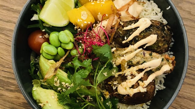 Friterad ost och spenatbollar, ris, salladsmix, avokado, mango, edamaebönor,