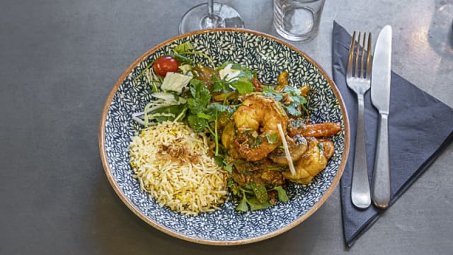 Lamm, spiskummin, paprika, tomat, friterad lök i currysås med bengalisk touch. Toppas med koriander.