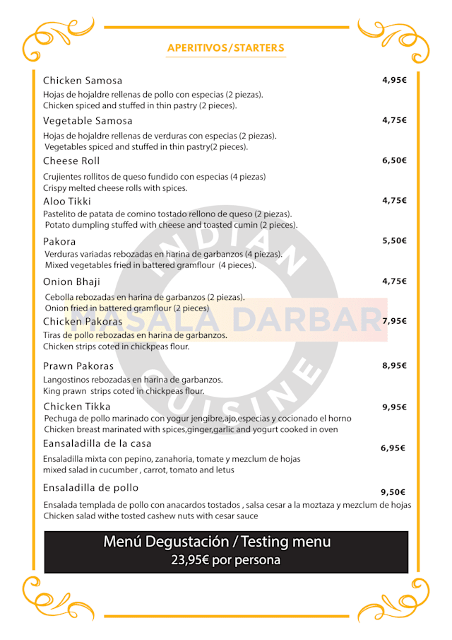 10/10Delicious food, a very spicy sous that my boyfriend loved (was given free of charge), everything prepared on the spot. Ciupitos on the house at the end veeery good (something with Mango and we had a heart drawn on each shot). Small details which impressed us, after the food impressed us. :) Sangria with real fruits, made in front of us (we saw how the bartender chopped the fruits) which was very tasty. Defintelly recommend and we will get back here next time when we are in Madrid. Thank you for the amazing service Masala Darbar.