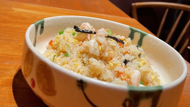 Arroz salteada con shitake y verdura, gamba salsa soja