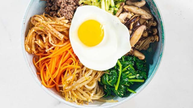 Œuf, riz, carotte, kimchi, shiitaké, épinard, courgette, soja