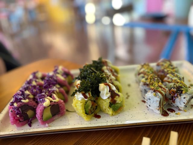Well, the rolls look interesting and very bright. But they bring nothing to the table except the presentation. They tried to make a symphony of different tastes, but instead made a mess of them. I ordered 4 different rolls and gyoza and NONE tasted good. The place is really pretty though. If i was them, i would change the concept from sushi to some hawaiian theme dishes. Like fried rice in pinapples and stuff like that.